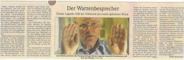 Geheuer ist ihnen nicht, was der »Warzenbesprecher« in »seinem Reich«, wie Günter Laganke den Behandlungsraum in seinem Haus bezeichnet, so »treibt«. Ständig parken Autos auf der Wiese neben dem Haus, Leute kommen und gehen. Die Meinung der Dorfbewohner interessiert den 69-Jährigen nicht, ebenso wenig der Blick über den Gartenzaun. Es hat sich herumgesprochen, dass der Mann aus dem niedersächsischen Bothel besondere Fähigkeiten hat, wenn es zum Beispiel um das Entfernen lästiger, hartnäckiger Warzen geht und kein Mittel bisher geholfen hat.